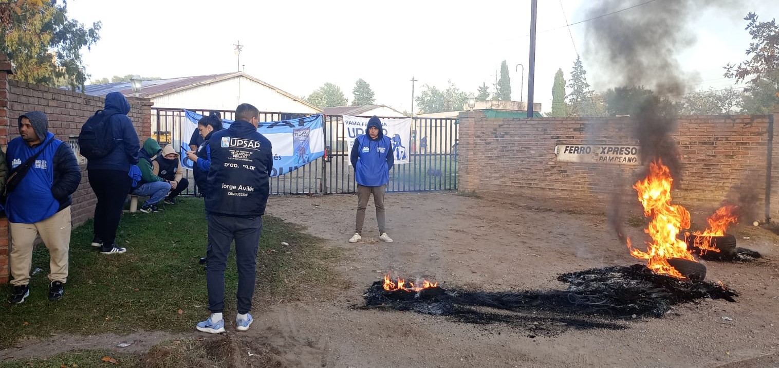 Dirigentes de UPSAP, el gremio que nuclea a los trabajadores de empresas de seguridad llevan a cabo una protesta frente a la sede de FerroExpreso Pampeano, en calle 10 entre 21 y vías. Según denunció el delegado regional Sebastián Saavedra, el origen de la manifestación es el despido de siete trabajadores de la empresa contratada para ofrecer seguridad en ese lugar, ya que FerroExpreso decidió convocar a otra prestadora de ese servicio.