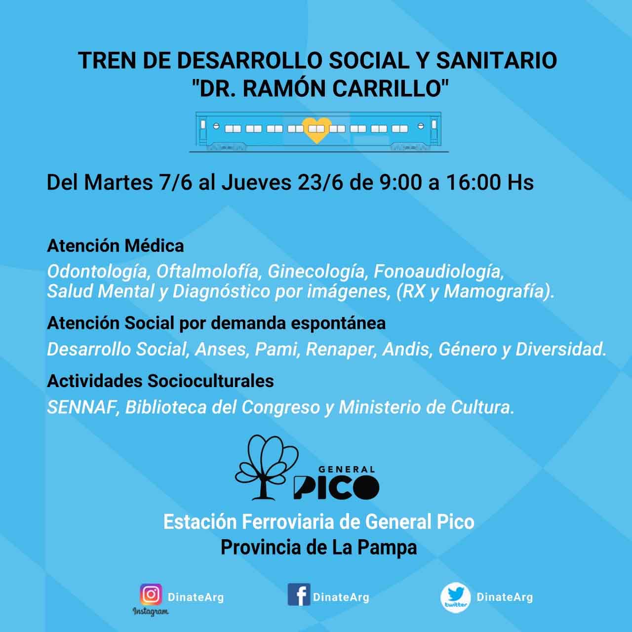 El Tren de Desarrollo Social y Sanitario ‘Dr. Ramón Carillo’ del Ministerio de Desarrollo Social de la Nación ya se encuentra instalado en General Pico y estará atendiendo de forma gratuita desde este martes 7 hasta el 23 de junio inclusive en la estación ferroviaria.