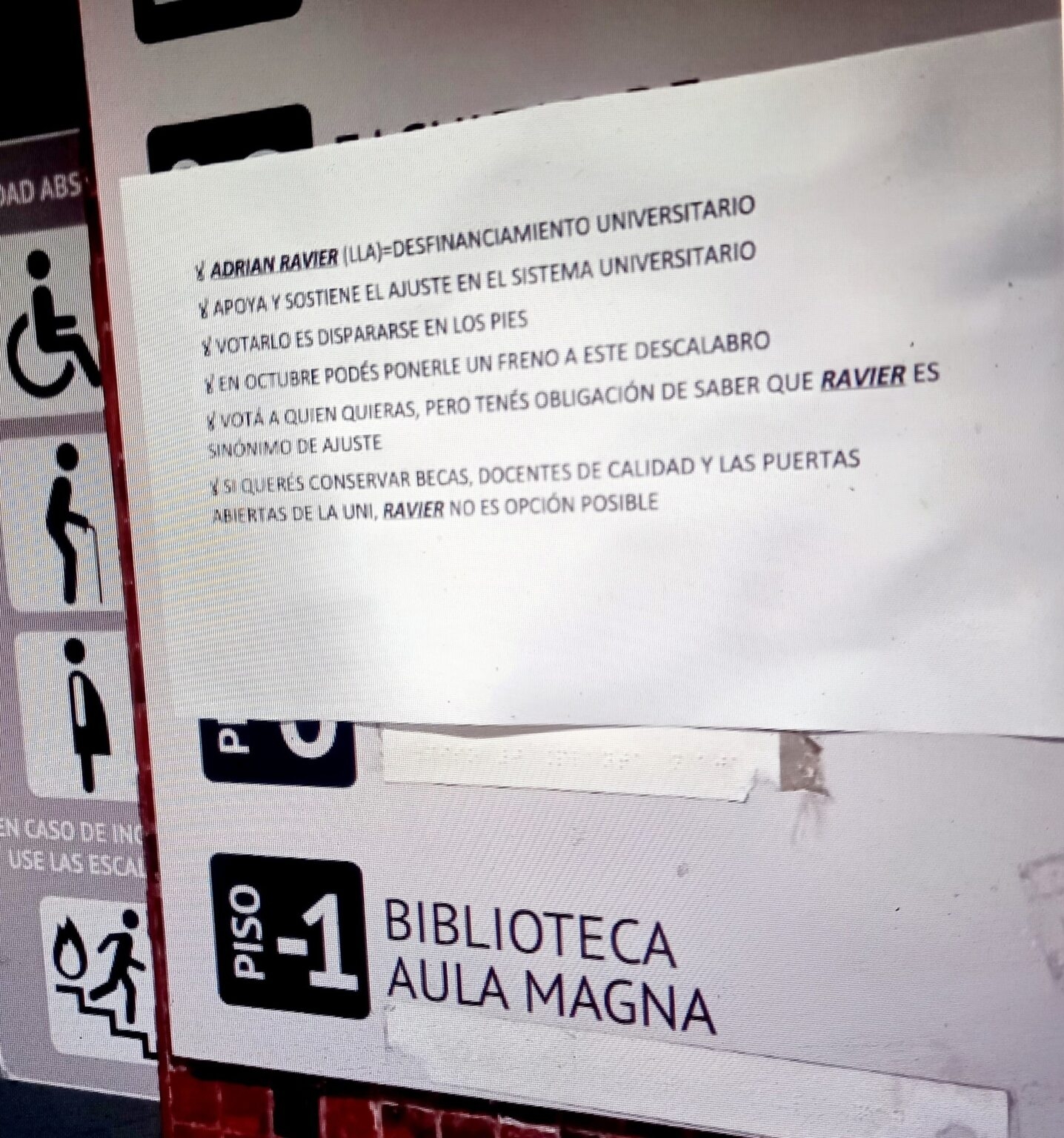 Se explica que “apoya y sostiene el ajuste en el sistema universitario”; “votarlo es dispararse en los pies”; “en octubre podés ponerle un freno a este descalabro”; “votá a quien quieras, pero tenés la obligación de saber que Ravier es sinónimo de Ajuste”.