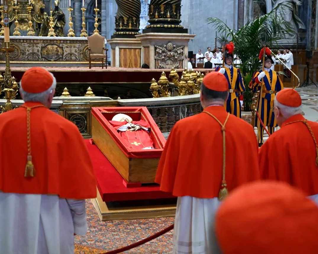 Según indicó la Oficina de Prensa del Vaticano, hombres, mujeres y niños de varios países formaron varias colas para despedirse del Sumo Pontífice, quien yacía en el ataúd con un rosario entre sus manos, un anillo de plata, la mitra blanca en su cabeza, vestido con una casulla roja y un palio con cruces bordadas en negro.
