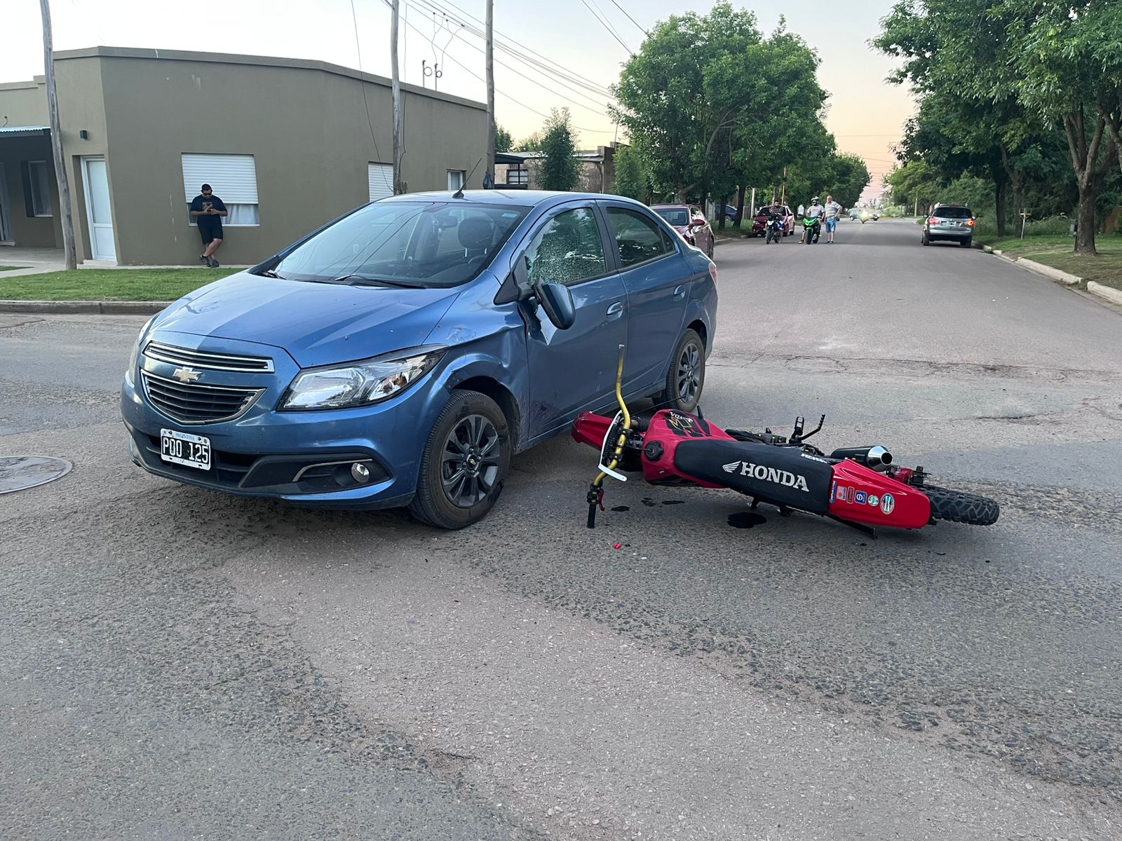 Más adelante, sobre las 19:30 horas, una motocicleta Honda 150 centímetros cúbicos colisionó el lateral izquierdo de un automóvil Chevrolet Prisma en el cruce de las calles General Roca y General Lavalle.