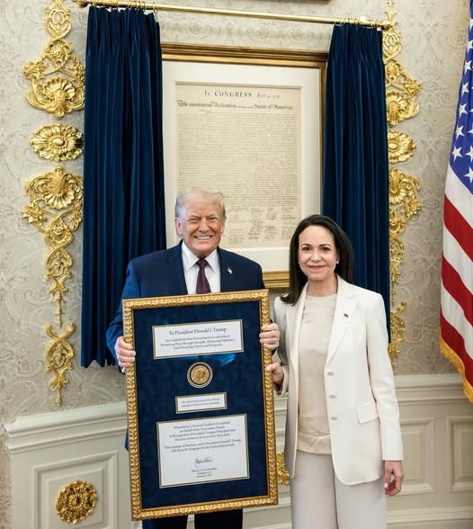 Machado asistió al encuentro vestida de blanco y llevó consigo un obsequio simbólico: un cuadro que incluía la medalla recibida en Oslo con motivo del Premio Nobel de la Paz, acompañado por un mensaje dirigido al mandatario estadounidense. “Al presidente Donald J. Trump. En gratitud por su extraordinario liderazgo en la promoción de la paz mediante la fortaleza, el avance de la diplomacia y la defensa de la libertad y la prosperidad”, decía la dedicatoria.