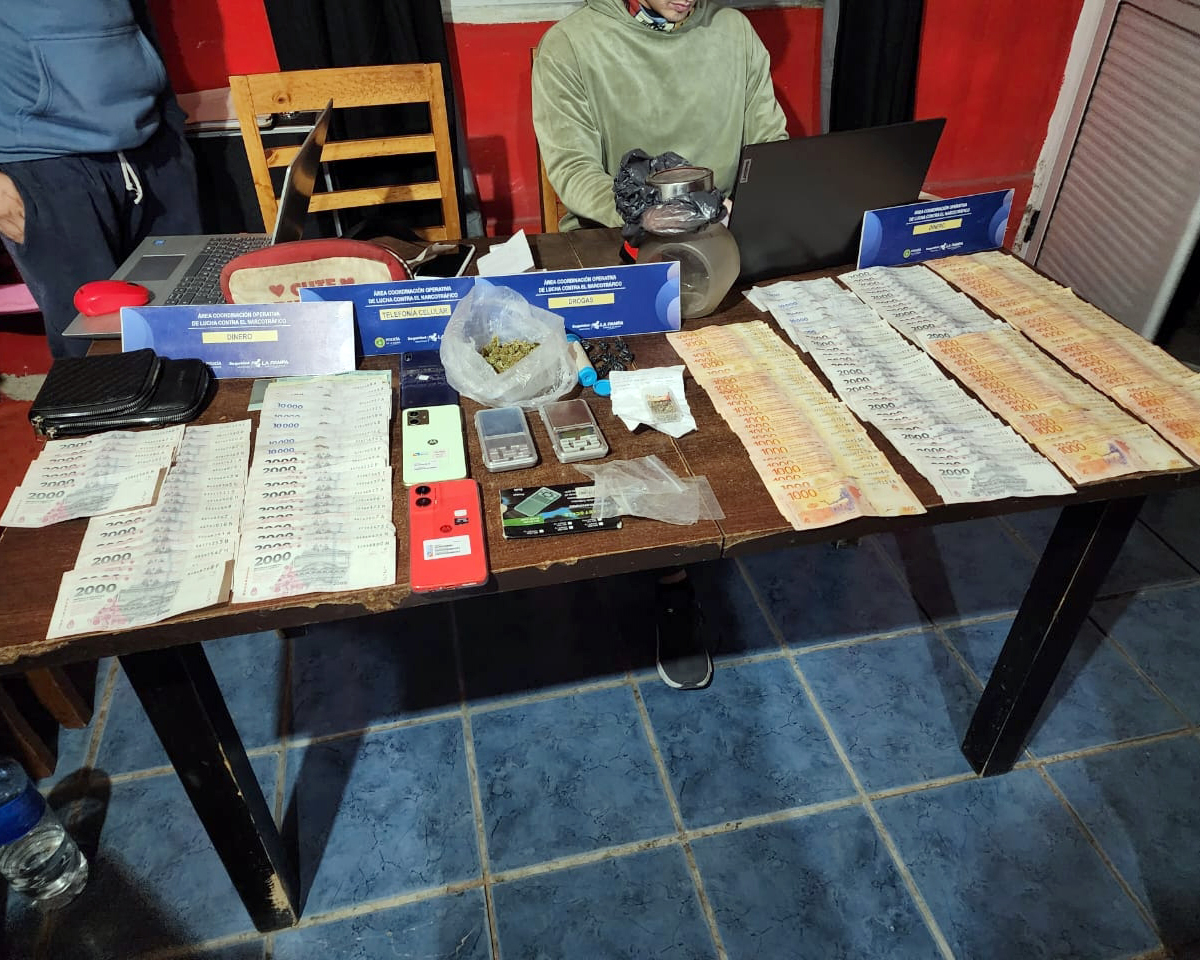 Durante la requisa de la vivienda se secuestraron ocho envoltorios de cocaína compacta, con un peso total de 5,6 gramos, una bolsa con 26 gramos de marihuana en floración, dos balanzas de precisión, tres teléfonos celulares, anotaciones y material de fraccionamiento. Además, se incautaron $ 628.000 en efectivo, 163 semillas de cannabis y dos motocicletas sin chapa patente.