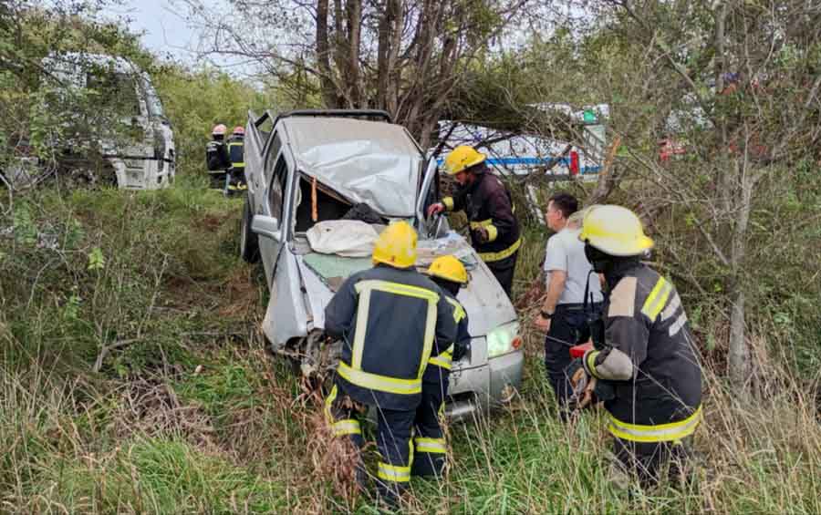 Las huellas marcan que la camioneta primero se desvió a la banquina izquierda, luego cruzó la ruta y terminó su recorrido contra un árbol en la banquina derecha. En el impacto el carro despidió el auto ocasionando también importantes daños materiales, mientras el tráiler quedó destrozado y doblado “en forma de V” abrazando el árbol.