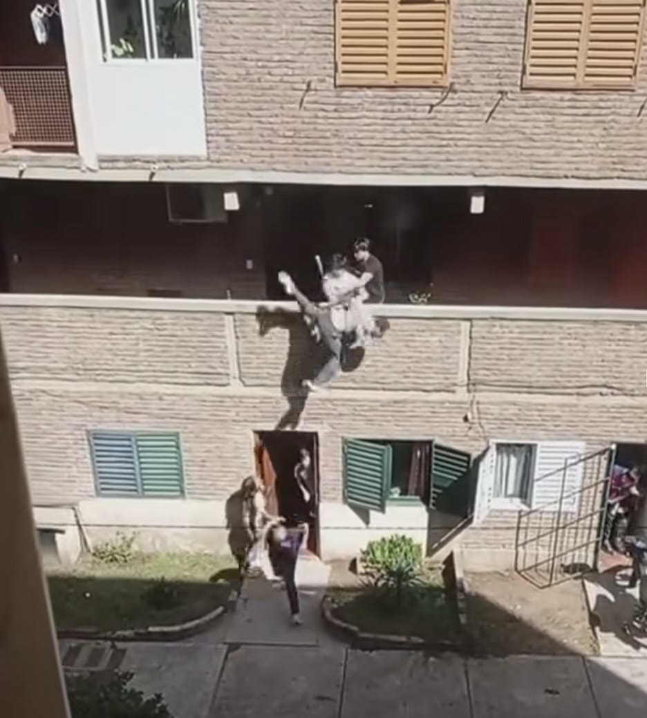 El momento de mayor conmoción ocurrió instantes después, cuando un hombre vestido con remera blanca levanta a la persona que estaba siendo agredida y la arroja por encima de la baranda hacia la planta baja, sin ningún tipo de contemplación.
