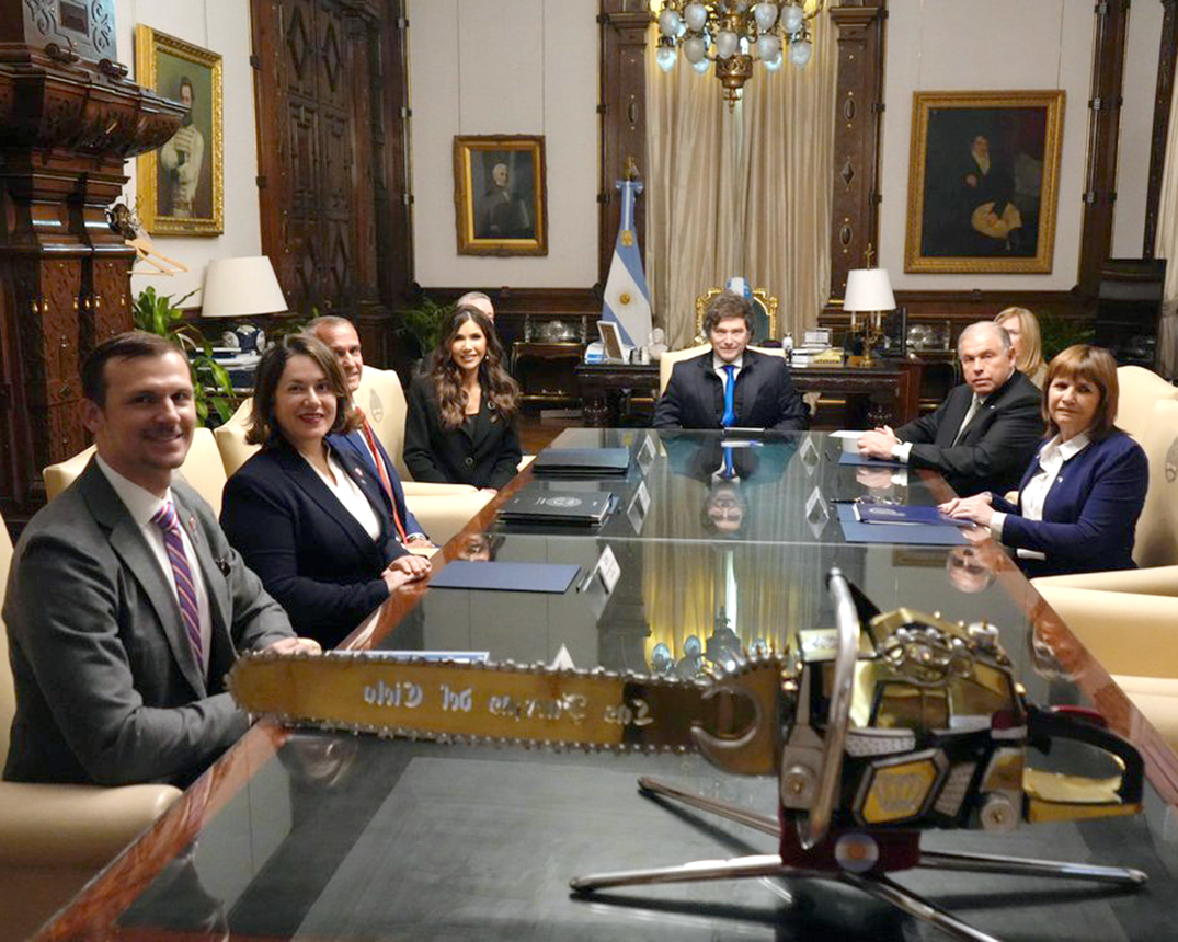 Al término, Noem fue acompañada al despacho del presidente Javier Milei para concretar el encuentro que contó además con la presencia de los ministros Patricia Bullrich (Seguridad), Gerardo Werthein (Relaciones Exteriores, Comercio Internacional y Culto) y Luis Caputo (Economía), aunque este último evitó salir en la fotografía que difundió presidencia.