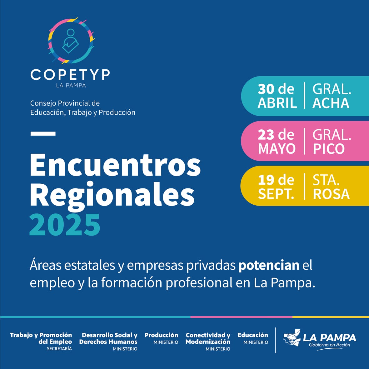 Este año, las jornadas que reúnen a representantes del sector público y privado de La Pampa se llevarán a cabo el 30 de abril en General Acha, el 23 de mayo en General Pico y el 19 de septiembre en Santa Rosa, anunciaron desde el Ministerio de Educación provincial.