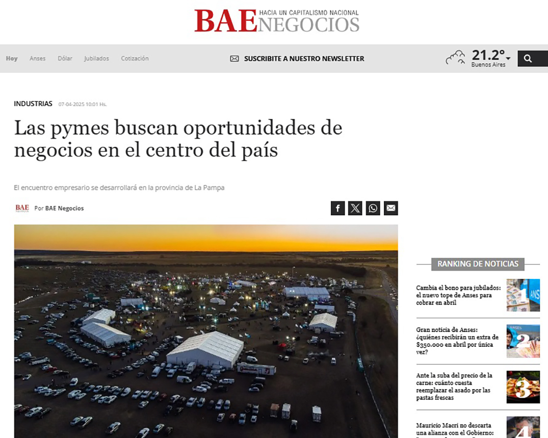 El diario económico BAE Negocios publicó recientemente un informe donde resalta el crecimiento sostenido del evento y su consolidación como un verdadero punto de negocios en el centro del país. Según se destaca, este año la Expo incorpora una propuesta innovadora que refuerza su carácter estratégico: el Centro de Negocios 360°, pensado para facilitar inversiones, vínculos comerciales y expansión de mercados para las PyMEs pampeanas y de otras regiones.
