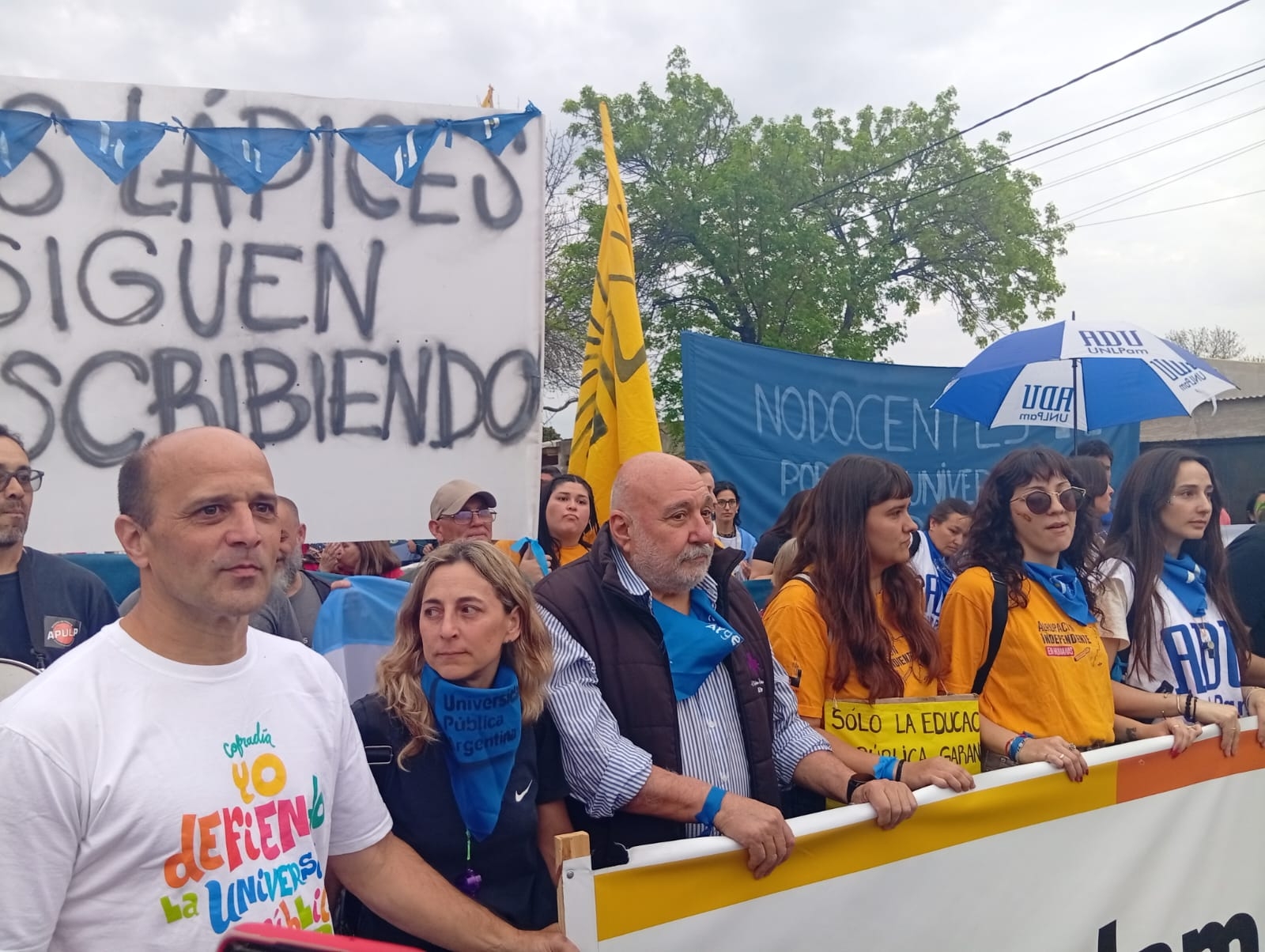 Quienes se encontraban al frente de la columna, entre ellos Abelardo Ferrán, marcharon sosteniendo una amplia pancarta con la leyenda: “Defendamos la Universidad Pública”.