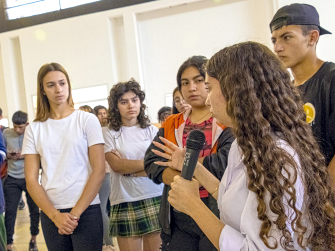 En el salón del Colegio Secundario Manuel Belgrano se reunieron estudiantes secundarios, delegados/as de curso, miembros de Centros de Estudiantes, profesores/as tutores, estudiantes de Institutos Superiores de Formación Docente, entre otros actores educativos.