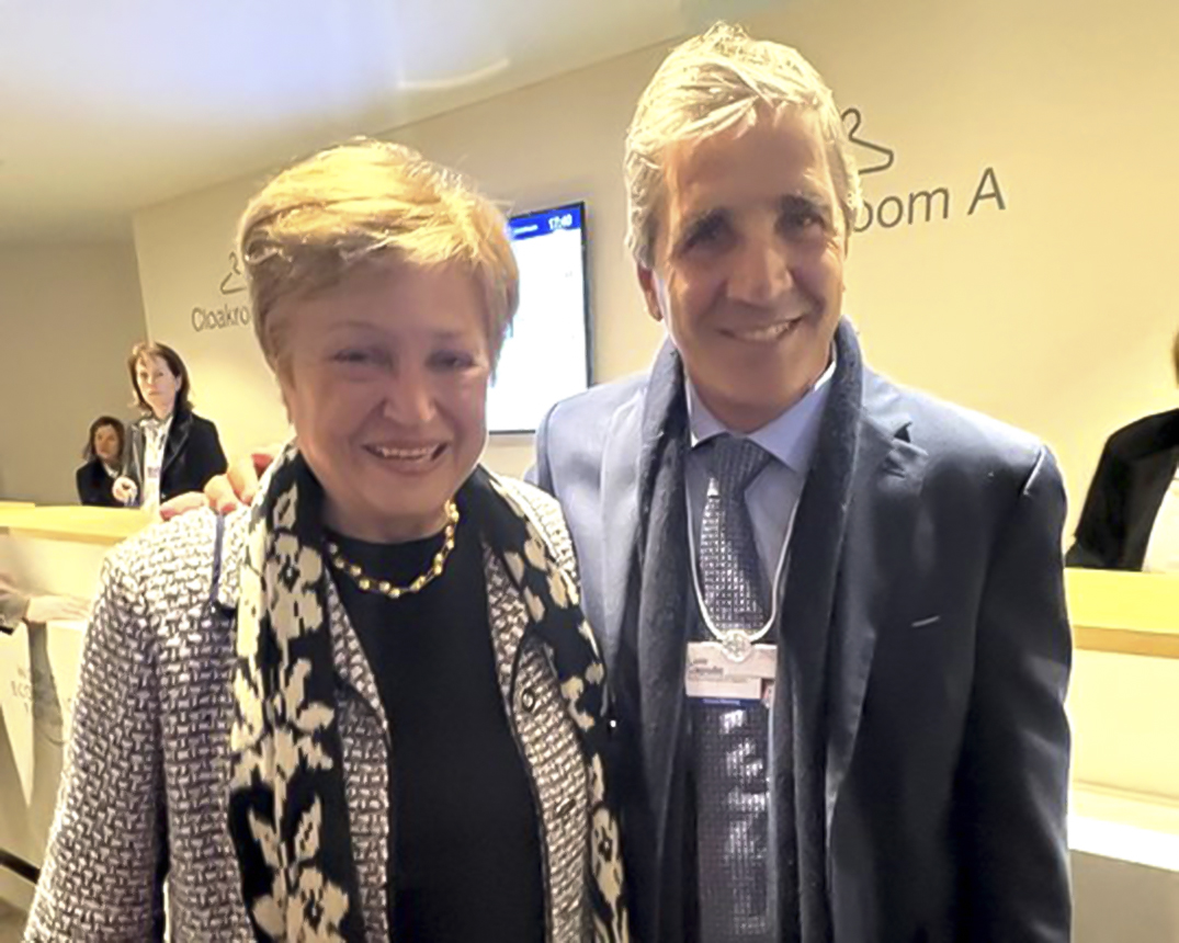 "Fue genial el breve intercambio con Luis Caputo en Davos. Aprecio la fuerte perfomance de la economía argentina y el progreso en la acumulación de reservas", dijo Georgieva, y publicó una imagen abrazada con el ministro en los pasillos del foro, delante de un guardarropas