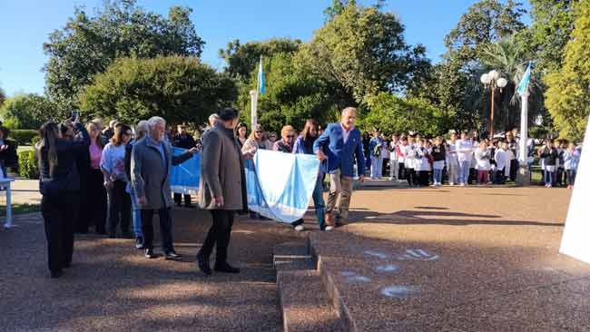 Durante el acto, las banderas de ceremonia de las instituciones presentes acompañaron el izamiento del pabellón nacional, seguido de la entonación del Himno Nacional Argentino.