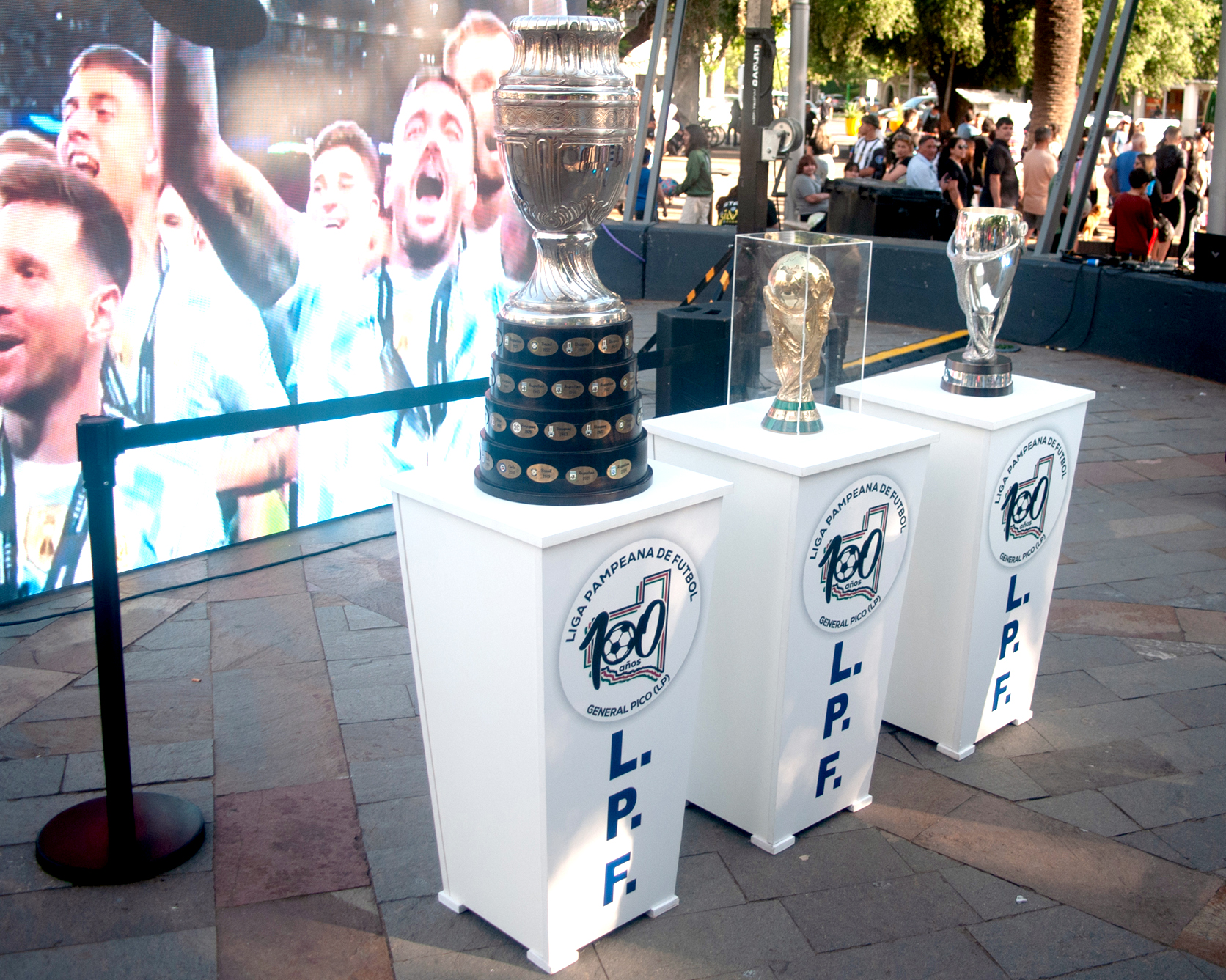 La plaza San Martín se vio invadida de público durante gran parte de la jornada de ayer. Por un lado todo lo que movió la maratón Aniversario (ver aparte), pero también por la exposición de las tres copas máximas logradas por la Selección Argentina de fútbol que dieron rienda suelta al programa principal de actos por el Centenario de la Liga Pampeana.