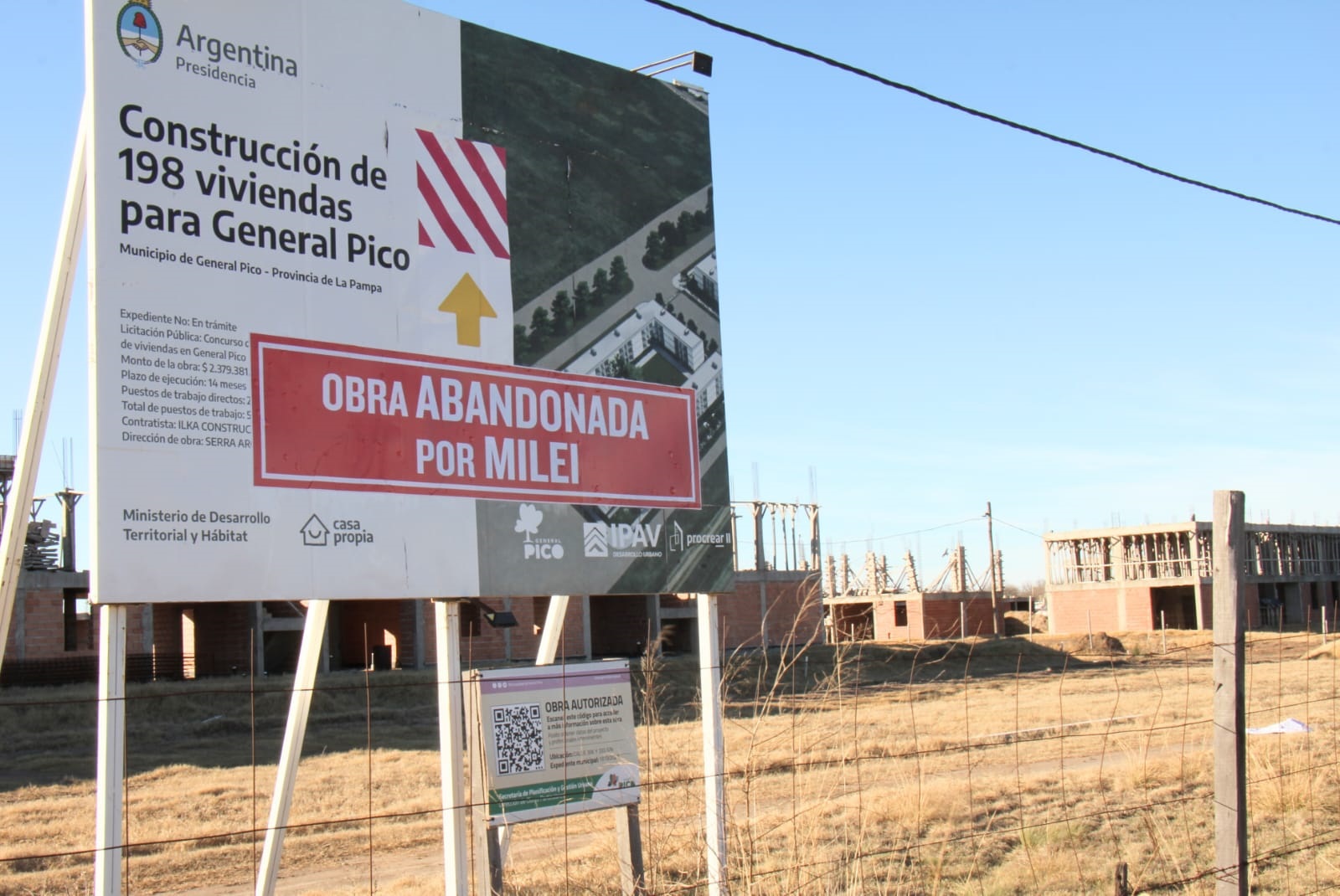 Los carteles, rojos con letras blancas, fueron instalados en el ingreso a la obra ubicada entre calle 333, Ruta Provincial 1 y calle 306. El proyecto había sido iniciado en 2022 y preveía una superficie total de 14.299 metros cuadrados. Según registros oficiales, al momento de su suspensión, las viviendas tenían apenas un 16,65% de avance.
