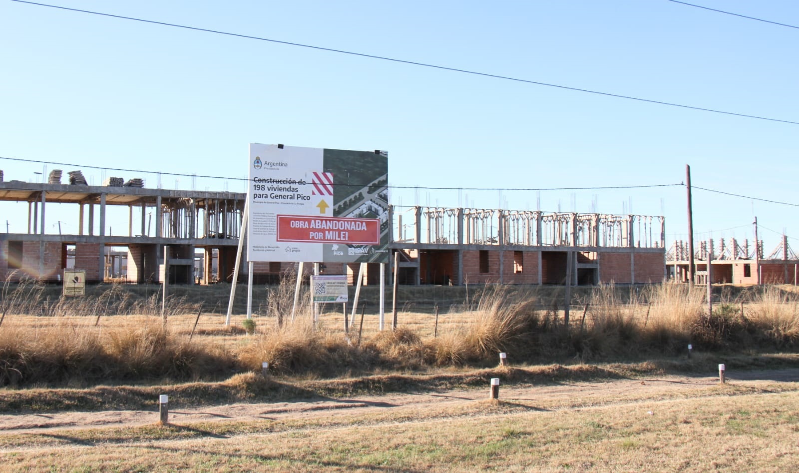 Los carteles que advierten: “Obra abandonada por Milei”. Están colocados en el predio donde debían construirse 198 viviendas del programa Procrear, que fueron paralizadas por decisión del Gobierno nacional tras la asunción de Javier Milei. La acción fue atribuida a militantes peronistas que buscan visibilizar el impacto del ajuste en el territorio.