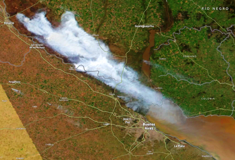 Una imagen capturada por un satélite de la NASA da cuenta de la magnitud del humo originado por los reiterados focos ígneos, principalmente en territorio de la provincia de Entre Ríos.