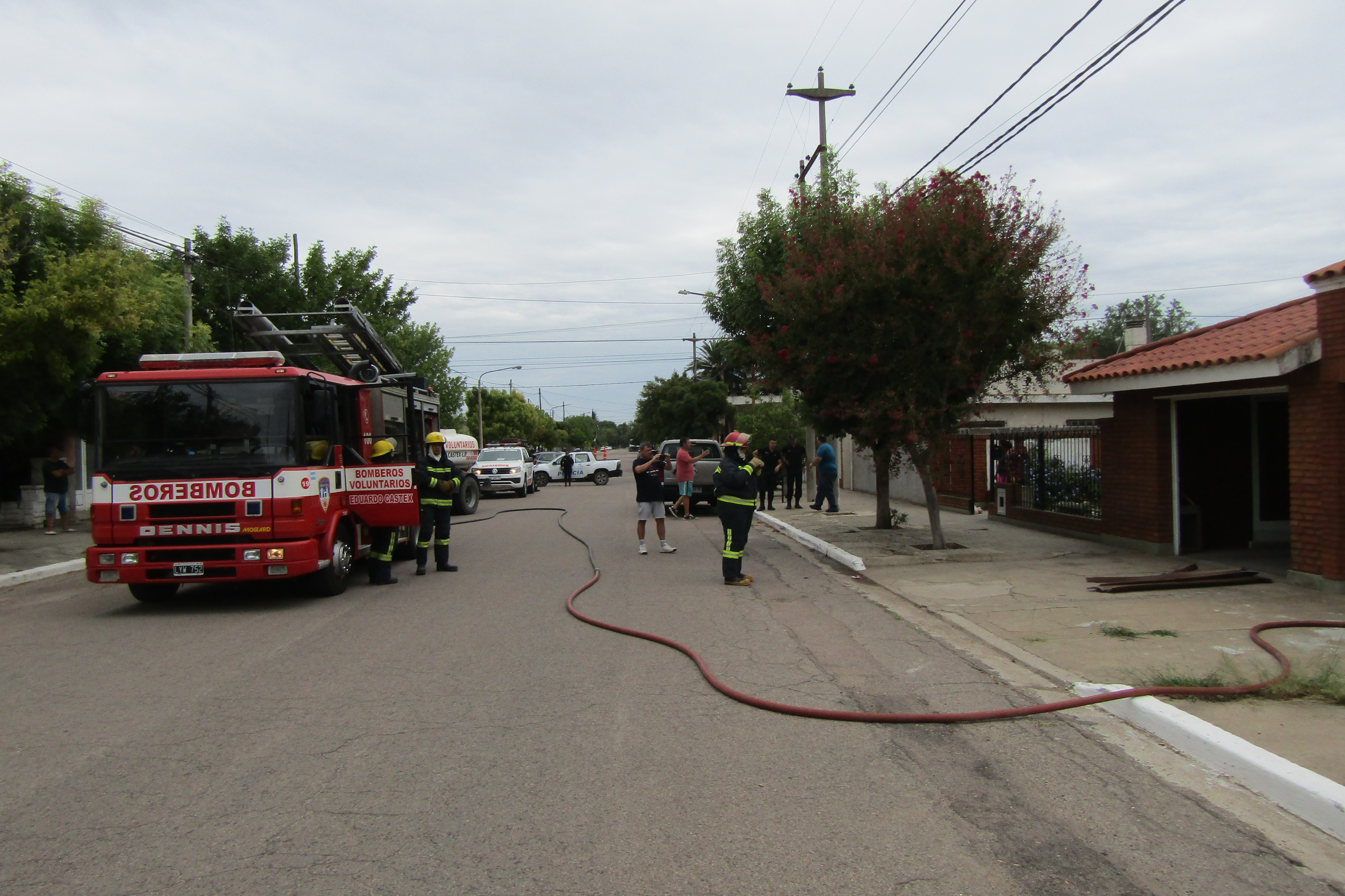 En el sitio trabajaron efectivos del Cuerpo de Bomberos Voluntarios de Eduardo Castex, personal policial y operarios de Camuzzi Gas Pampeana, quienes procedieron a cortar el suministro de gas como medida preventiva para evitar mayores riesgos.