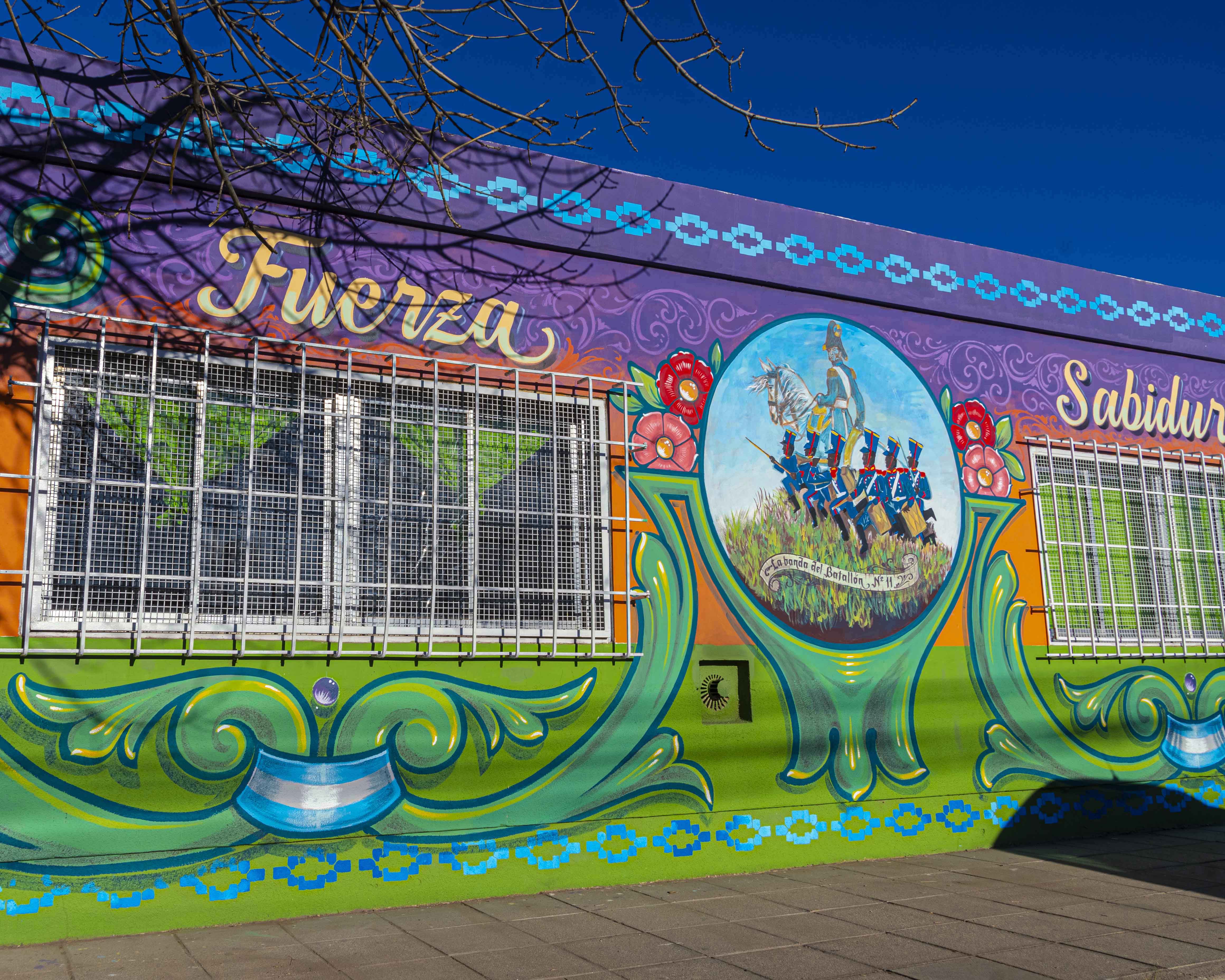 El mural fue pintado en tres días por estudiantes, docentes y familias quienes se hicieron presentes en distintos momentos de cada jornada. Tampoco faltaron algunos vecinos que se acercaron con mates y con algún material o escalera que hizo falta. La directora destacó que el fin de semana largo del Día de la Bandera era un momento significativo para realizar un mural sobre San Martín y sus Granaderos, junto a Belgrano y María Remedios del Valle.