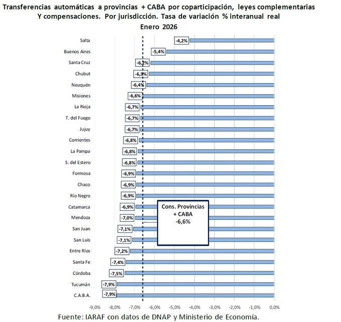 “Descenso real interanual del 6,6% de las transferencias automáticas a provincias y CABA durante el mes de enero de 2026”, según un estudio publicado por el consultor Nadín Argañaraz
