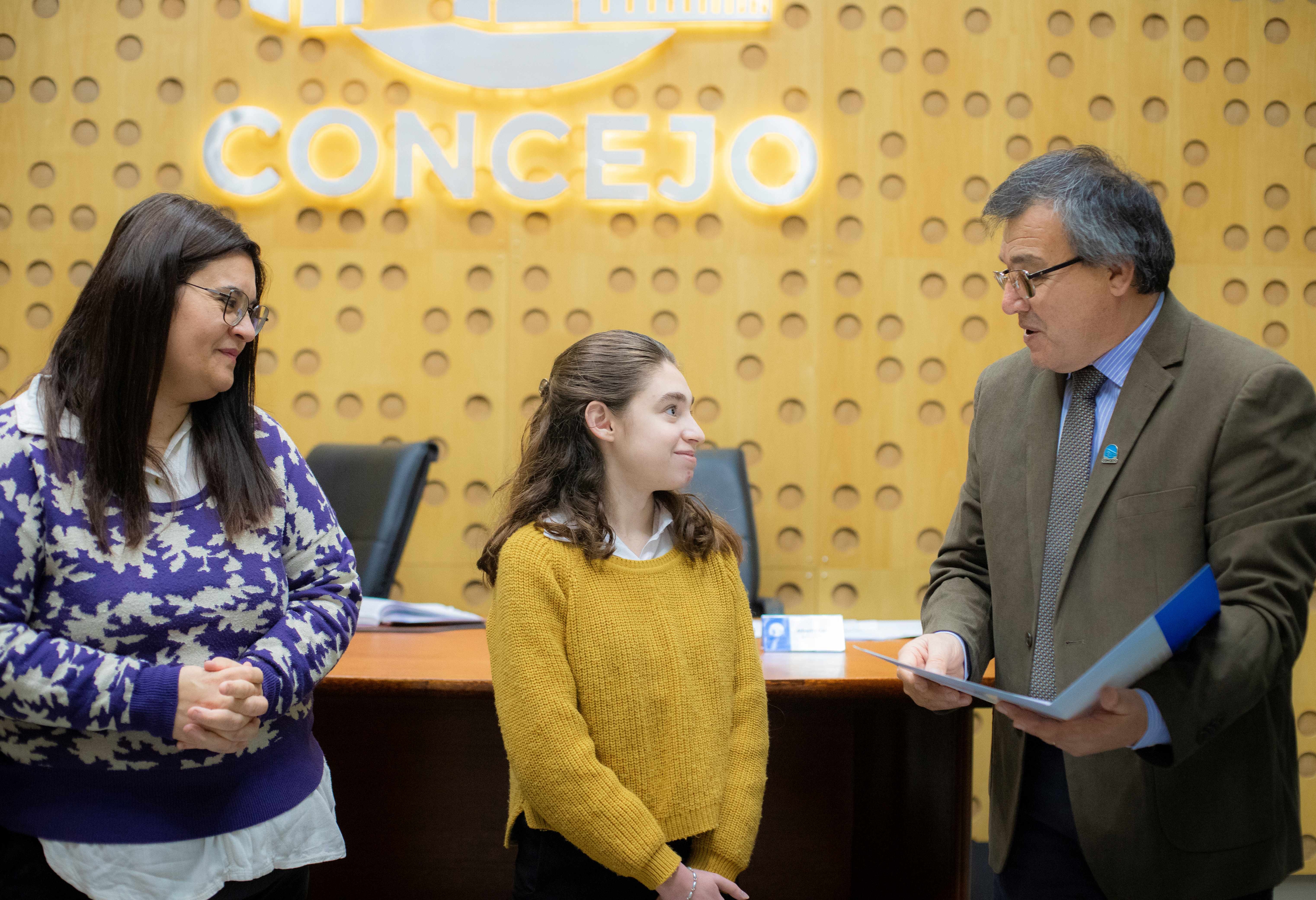 Previo al inicio del orden del día, el presidente del cuerpo legislativo, Alberto Campo, invitó a acercarse al frente del recinto a Valentina Nilles, joven reconocida en sesiones anteriores por su destacada participación en las Olimpíadas de Filosofía realizadas en Bari, Italia, a quien se hizo entrega de la normativa que la destaca y una placa en homenaje a sus logros.