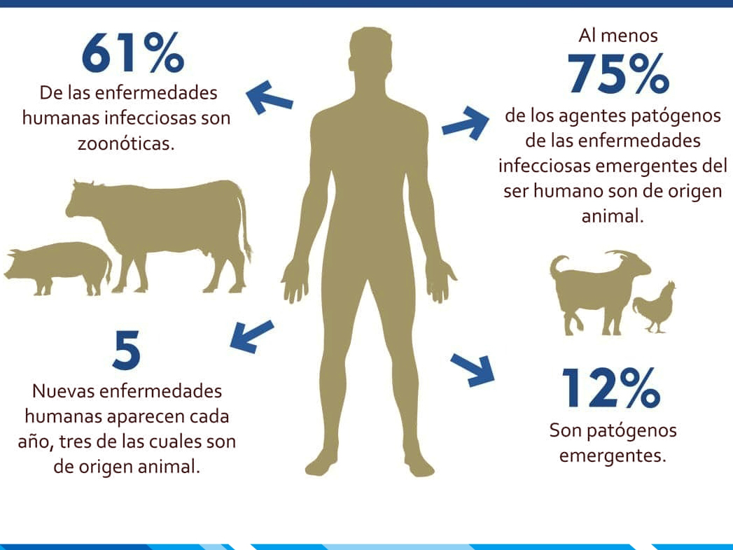 Se debe tener en cuenta que el 60% de las enfermedades humanas infeccionas son zoonóticas, al menos un 75% de los agentes patógenos de las enfermedades infecciosas emergentes del ser humano son de origen animal. De cada cinco nuevas enfermedades humanas que se registran por año, tres provienen de los animales.