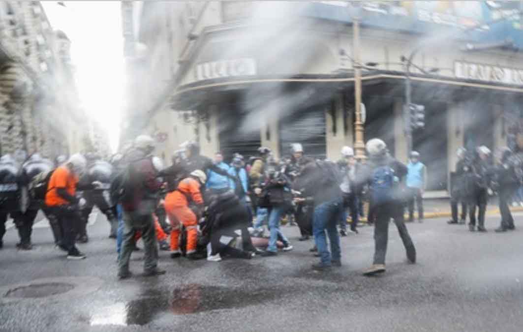 Durante el operativo policial, el fotoperiodista Rodrigo Abd, fue alcanzado por el chorro de un camión hidrante mientras cubría la protesta. El impacto fue directo a la cabeza y lo derribó al instante, obligando a sus colegas a asistirlo y llevarlo a una zona más segura.