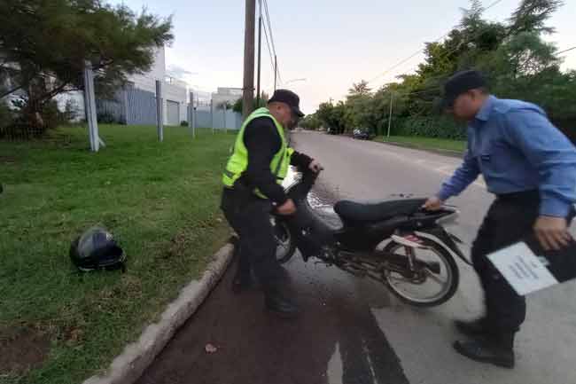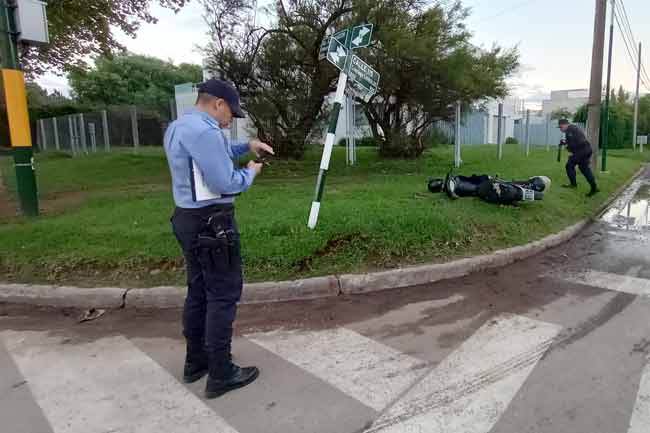 En su afán de evitar el impacto contra el auto, quien se encontraba al mando de la moto intentó evadir la situación y terminó golpeando primero contra el cordón y más tarde con el cartel que señaliza las calles.