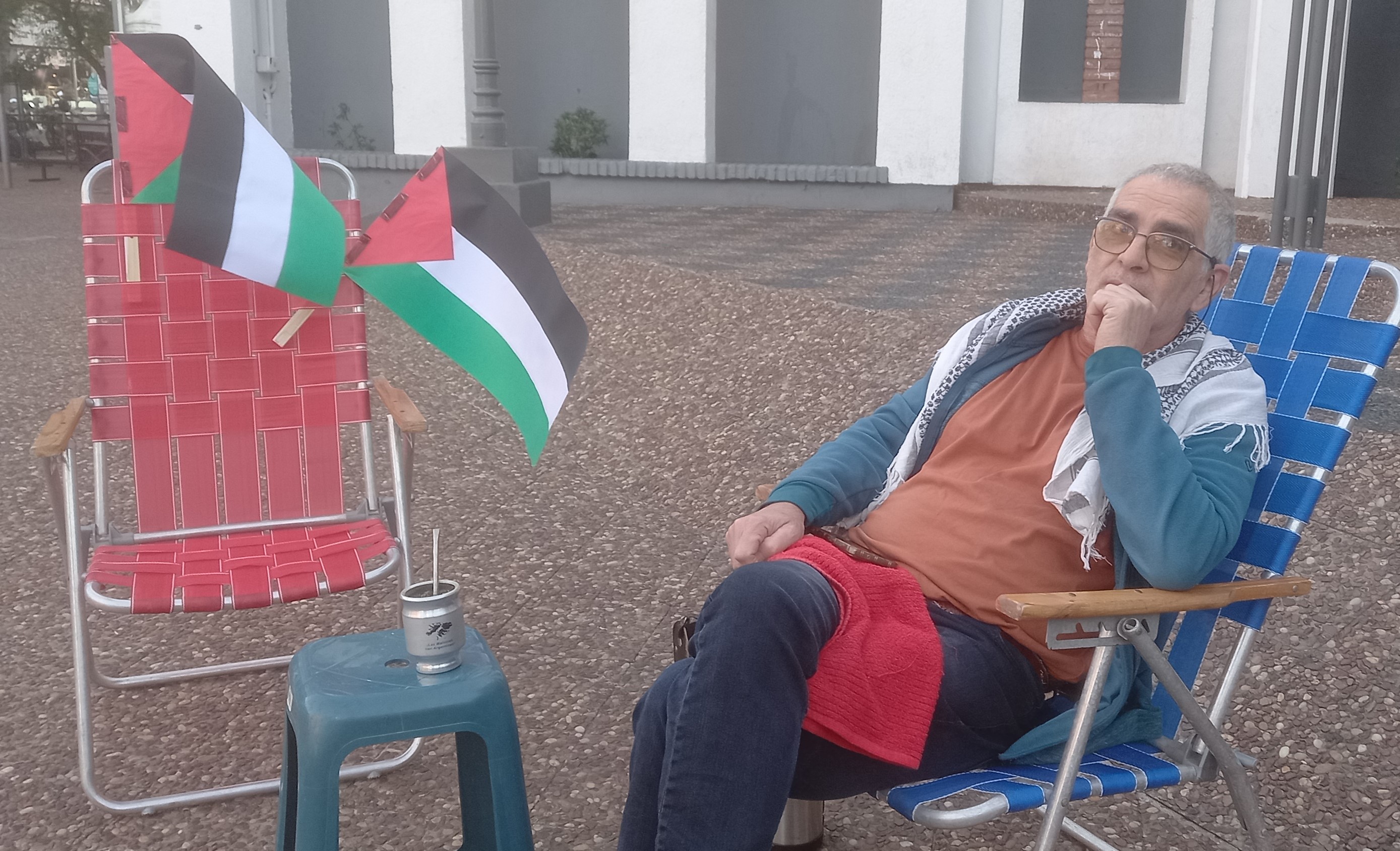 El ex dirigente cooperativo sostuvo que “hay un hostigamiento a la flota humanitaria de parte de la flota israelí, que detuvo a alguno de los barcos. Últimamente me estuve expresando a través de las redes sociales, pero ahora quería hacer algo distinto para expresar mi repudio a lo que está ocurriendo; y se me ocurrió venir a la Plaza Seca a tomar unos mates, en vez de hacerlo en mi casa. Como no conseguí en Pico banderas de Palestina, hice dos con cartulina”.