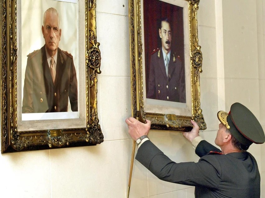 “Proceda”, le indicó el santacruceño al entonces jefe del Ejército, Roberto Bendini, quien se paró sobre un banquito y bajó los retratos de los dos máximos íconos de la represión ilegal y del terrorismo de Estado.